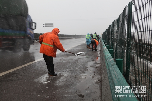 2月9日,江西省迎来了2014年的第一场雪,作为交通服务行业,梨温高速鹰潭管理处第一时间为司乘群众安危着想,迅速组织机关人员全员出击,到高速公路上对陡坡、大桥等易结冰打滑路段进行铲雪除冰、撒盐防冻,并在路缘带、路肩为雪水清出排水通道,防止路面积水结冰,为来往车辆保驾护航。