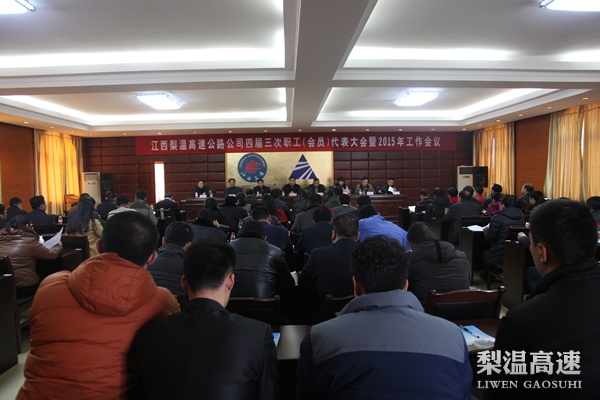 2月13日上午,梨温公司召开四届三次职工代表大会暨2015年工作会议,同时套开廉政工作会议、安全生产和综治工作会议。总公司总经理陈立新出席会议并为先进集体、先进单位、先进工作者、收费能手代表颁奖。梨温公司总经理潘皓作行政工作报告,党委书记周洪达作重要讲话,副总经理邱国土宣读2014年度先进表彰决定,副总经理余毓玲主持第二阶段会议,总经理助理付群作安全生产和综治工作报告,纪委副书记梅水平作廉政工作报告。梨温公司领导邓琼华、饶奇志出席会议,先进集体、先进工作者、收费能手、职代会和工作会代表等共80余人参加了会议。