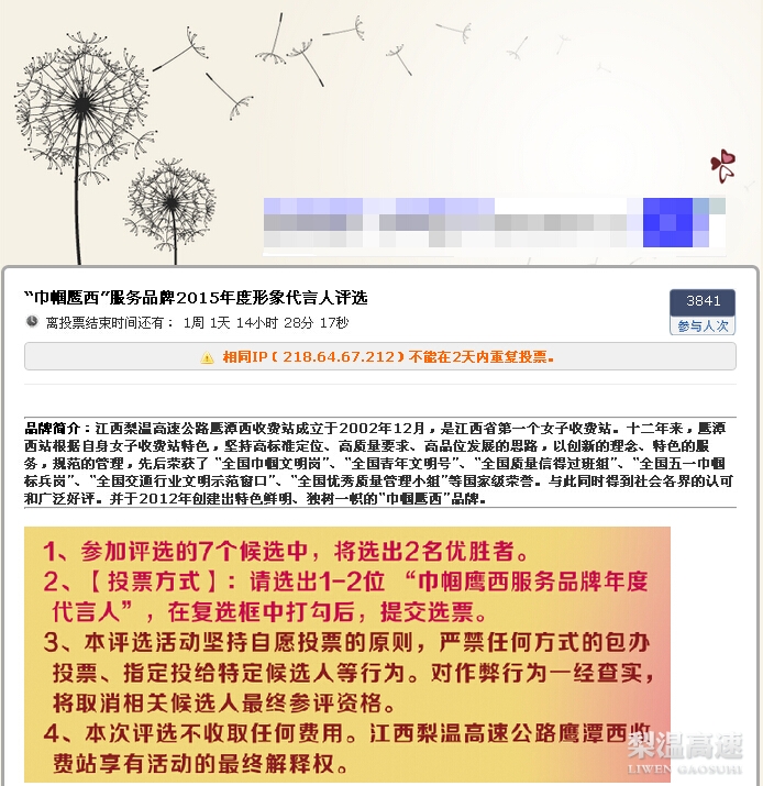 据网络统计,梨温高速鹰潭西收费站2015年“巾帼鹰西”服务品牌形象代言人活动参与人数众多,活动开展2天来,参与网络投票的人数已飙升至3841人。该活动3月18日结束,分为候选人征集、候选人精选、网络投票评选、选定品牌代言人四个阶段。日前,前2个阶段已经结束。
