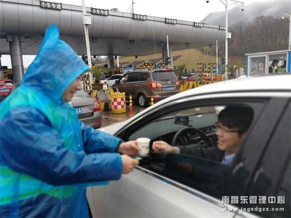 早晨九时,省界气温偏低,南昌南管理中心赣浙收费所组织人员推着便民服务车,为短暂停留在收费点缴费的司乘人员送去一杯杯热气腾腾的姜汤。工作人员还将姜汤送至辛勤工作的收费人员和高速交警值守人员手中。