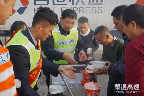 在东昌高速各收费站,南昌南管理中心以“美丽高速 满意窗口”全省收费站形象提升活动为契机,推出系列温馨服务举措,特别针对大雾、冰冻等恶劣天气,配备统一的便民服务车。当日凌晨,该路段接交管部门通知,暂时封闭。看到焦急等待的乘客冻得瑟瑟发抖,收费站工作人员随即推出便民服务车,给现场乘客送上热腾腾的面条、方便面、姜汤、开水等。在场乘客被收费站贴心的服务感动,纷纷表示,吃过充满爱心的早餐,身体暖了,心更暖了。(文/李冬盈 图/黎小燕)