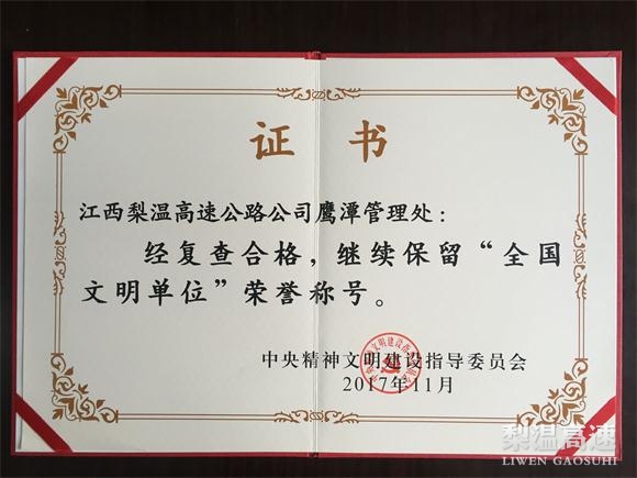 近日,从中央精神文明建设指导委员会文件和江西省文明网得知,中心六家单位通过了江西省第十四届文明单位和第五届全国文明单位2017年度复查工作,其中鹰潭收费所保留第五届全国文明单位称号。
