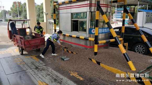 鹰潭东收费站:千斤饲料封车道,收费员清理保畅通
