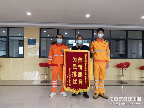 1月25日,抚州市东乡的周师傅将一面印有“热情服务,为民排忧”字样的锦旗送到江西交投集团南昌南管理中心清障救援队东乡中队工作人员手中,并连声道谢:“没有你们帮助,我一个人真不知道该如何是好,太感谢你们了!”