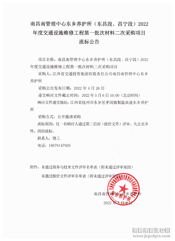 南昌南管理中心东乡养护所(东昌段、昌宁段)2022年度交通设施维修工程第一批次材料二次采购项目流标公告