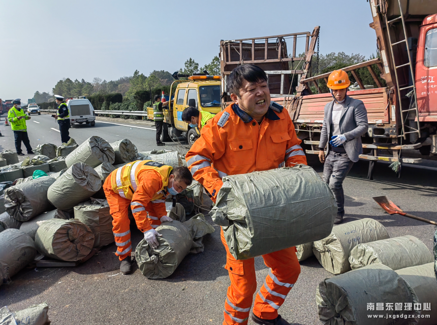 1月17日10时,沪昆高速梨温段上海方向K532公里处发生一起小货车爆胎侧翻事故,事故车占用超车道,货物散落一地,南昌南管理中心车辆救援队杨梅岭中队快速处置,确保了高速公路安全畅通。