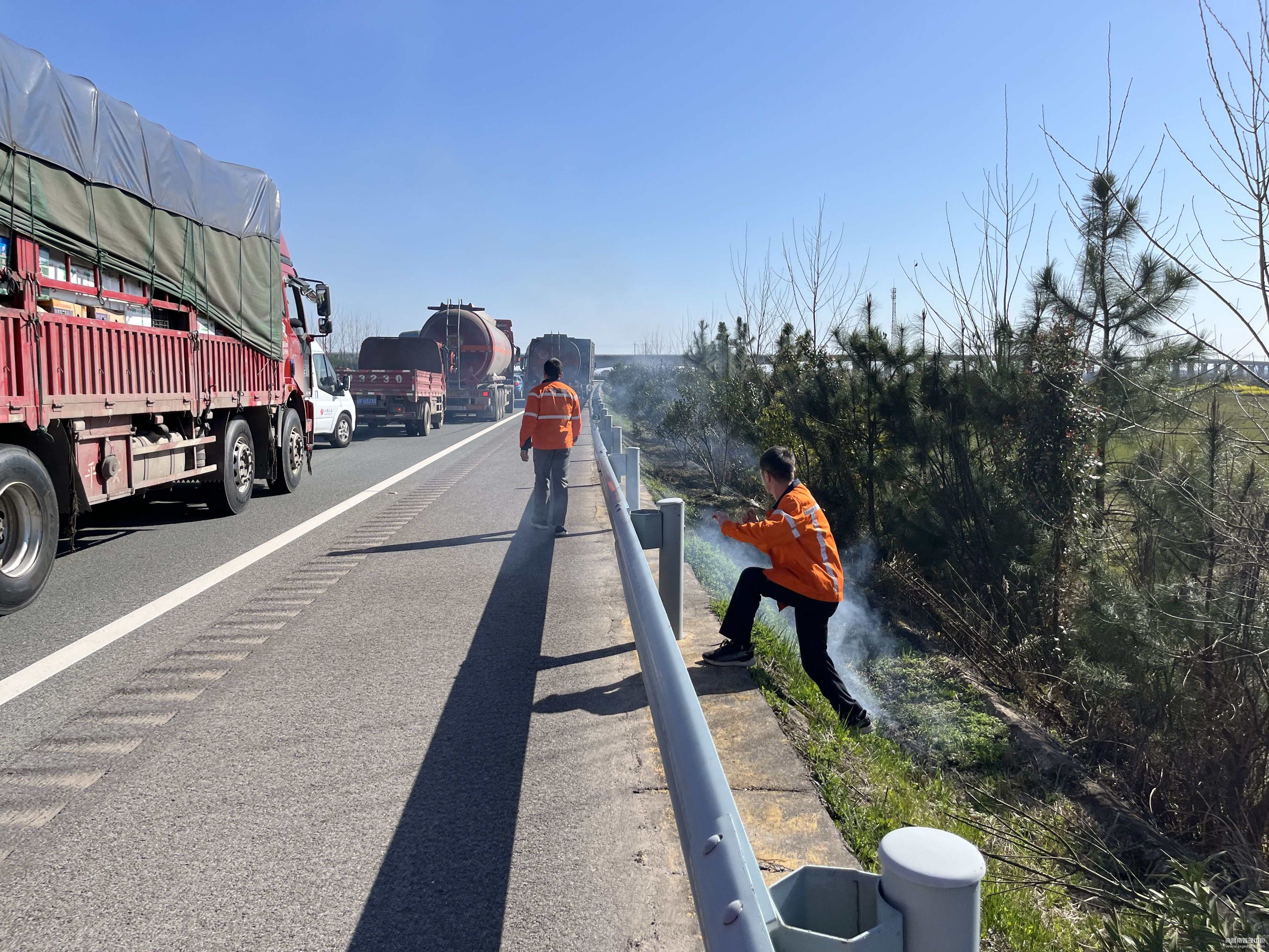当日下午15点20分,该站养护人员巡查至K18+300南昌往宁都方向时发现前方路况拥堵,车辆行驶缓慢且天空中飘着一股黑色浓烟。