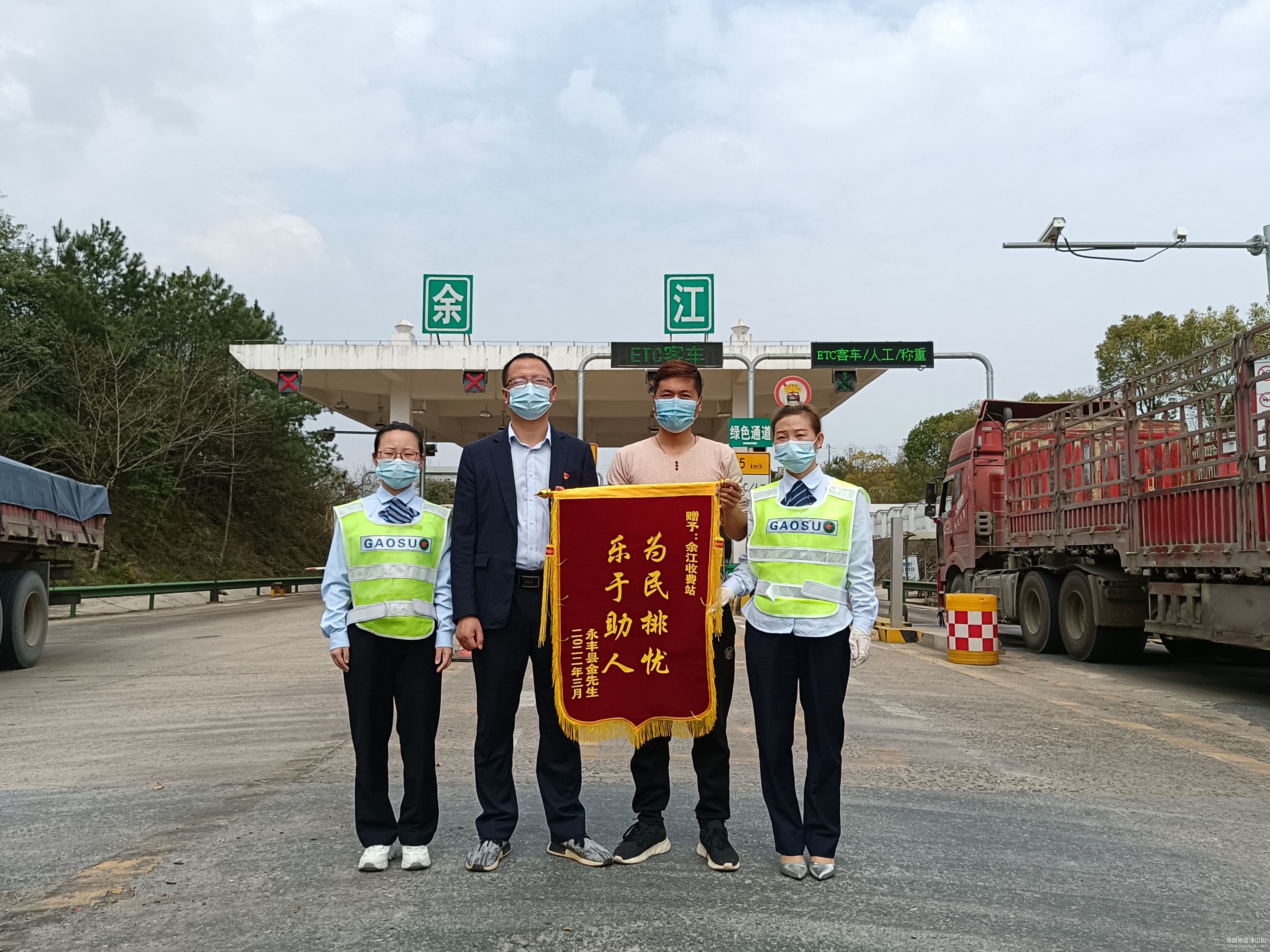 3月14日下午,一位车主途径南昌南管理中心余江收费站时,手捧一面“乐于助人,为民排忧”的锦旗,郑重地交到该站工作人员手中对他们的真诚帮助表示感谢。