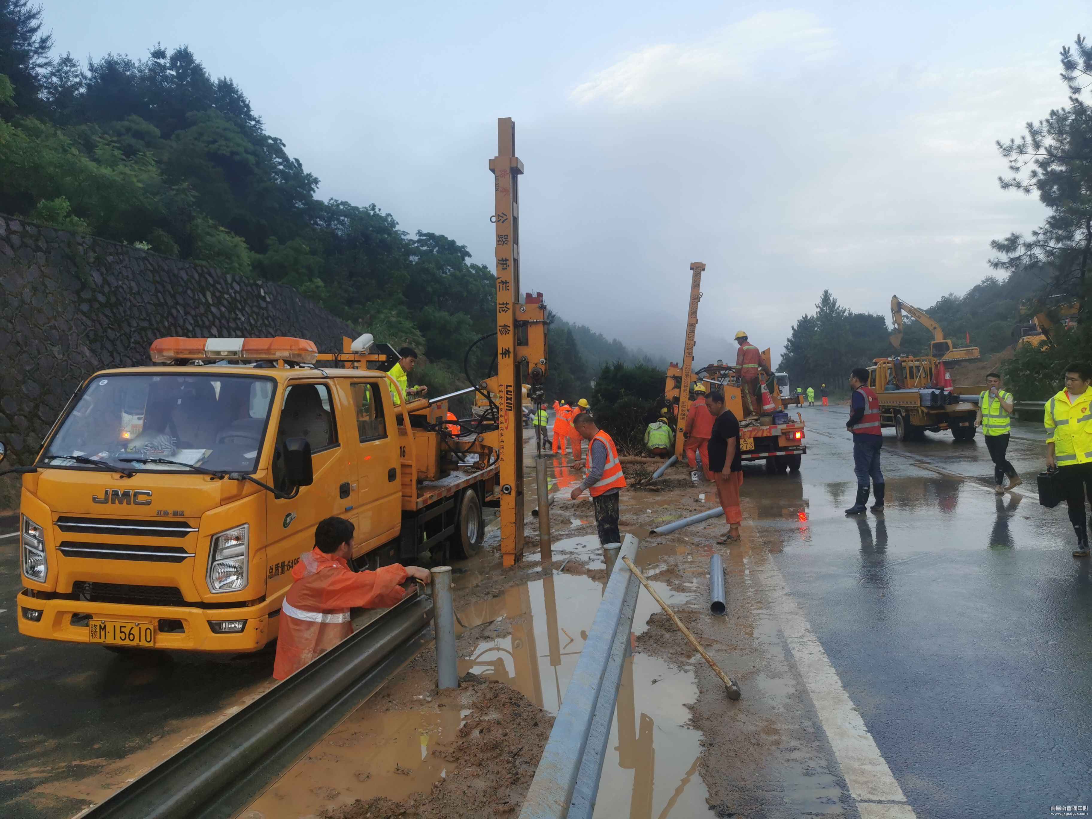 6月20日,受连续暴雨影响,梨温高速沪昆段K461+800左幅发生大面积山体滑坡,塌方土方量5000余立方米,砂土覆盖路面长200多米,造成高速公路双向通行中断。南昌南管理中心东乡养护所交安设施维修队紧急抢修被冲毁的中央隔离护栏和立柱,以最短时间完成了抢修任务。