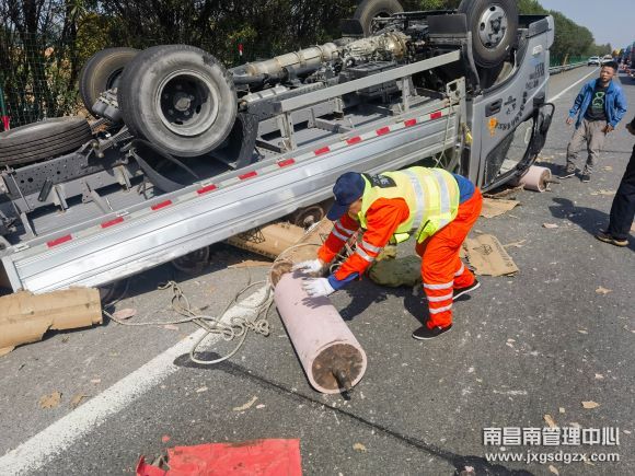 现场发现散落货物有近60个模具,一个约两百多斤,人工无法搬动,需要使用吊机才能完成转运,该队负责人立即安排中队救援车辆随车吊及抢修转货车辆过来,随后把掉落在行车道的模具一个个慢慢的滚到应急车道。14点50分救援车辆到达现场,立刻展开作业,15点10分事故车辆被成功吊正,由于货物散落了一地,经过大家3个多小时的努力,总算是将60多个模具全部的吊装至转运车上。