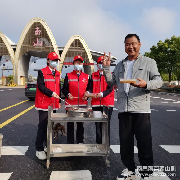 “请您别着急,吃碗早点吧”他们给司机端来一碗碗热乎乎的面条。现场,还有五六名身穿红马甲的青年在等待的车辆中穿梭,他们是玉山收费站高速映山红志愿者。