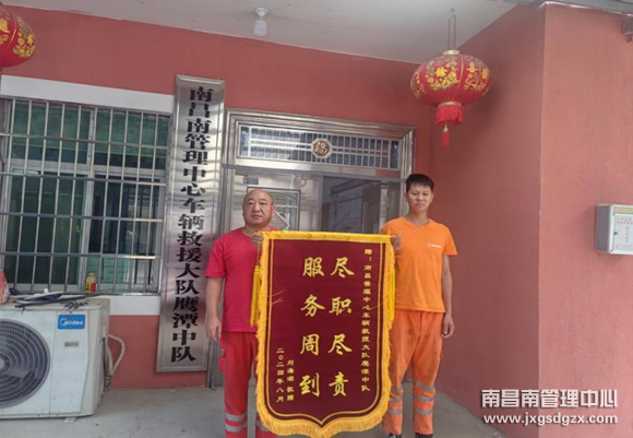 9月5日,南昌南车辆救援大队鹰潭中队收到了一个特别的快递,快递里面是一面锦旗,上面赫然印着“尽职尽责 服务周到”八个大字。回拨快递上的电话号码,中队队员们才记起当天的救援经历。